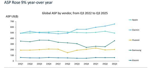 该机构指出,受头部厂商推动,2025 年第 3 季度全球可穿戴腕带设备平均售价(ASP)为 225 美元(IT之家注:现汇率约合 1593 元人民币),同比上涨 9%。