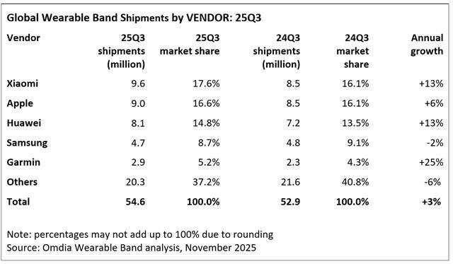 IT之家 12 月 2 日消息,市场调查机构 Omdia 昨日(12 月 1 日)发布博文,报告 2025 年第 3 季度全球可穿戴腕带设备呈现显著的高端化趋势,呈现“量稳价升”态势,出货量 5460 万台、温和增长 3%,但产值达到 123 亿美元,同比激增 12%。