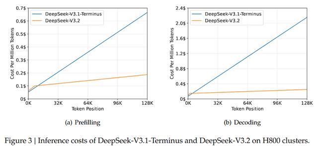 结合工程优化,DeepSeek-V3.2在H800 GPU上实现了显著的端到端加速,并在短上下文下利用专门的掩码模式进一步提升效率。总体而言,DeepSeek-V3.2在保持能力不降质的同时,有效突破了长上下文推理的性能瓶颈。