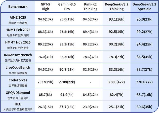 DeepSeek称,标准版的DeepSeek-V3.2在公开的推理类基准测试中,达到了GPT-5的水平,仅略低于Gemini-3.0-Pro;相比Kimi-K2-Thinking,V3.2的输出长度大幅降低,显著减少了计算开销与用户等待时间。