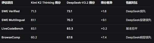 在DeepSeek-V3.2和Kimi-K2-Thinking两款模型均公布结果,且测试设置相同的基准测试上,DeepSeek-V3.2均领先于Kimi-K2-Thinking。