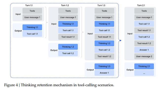 在后训练中,DeepSeek-V3.2着重解决“思考模式与工具使用如何结合”的难题。为了避免模型在多轮工具调用中频繁重复推理,他们设计了一套新的上下文管理机制:只有当出现新的用户消息时才会清除思考轨迹,而工具输出的追加并不会导致推理内容被丢弃。