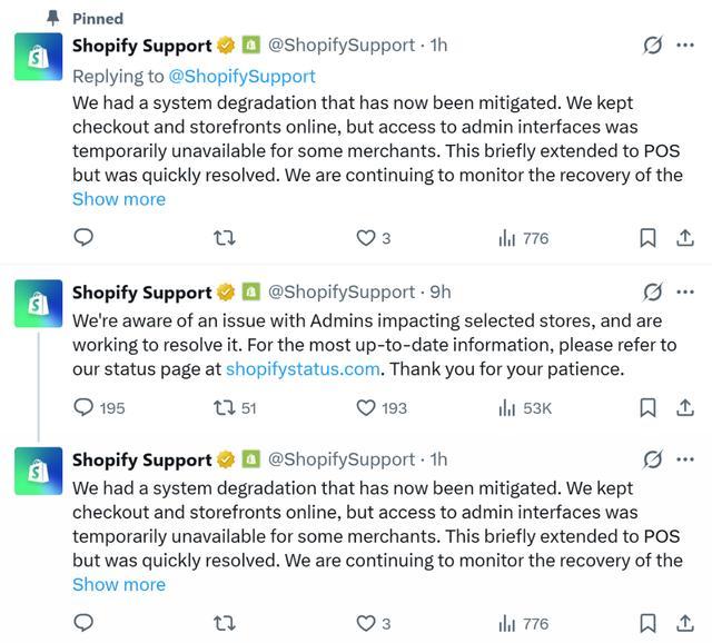 据她所述,Shopify的服务在上午9点左右中断,直到下午2点30分左右才恢复。在此期间,虽然客户仍能提交订单,但她的公司无法监控销售、追踪库存,也无法回答客户关于货运的服务问题。