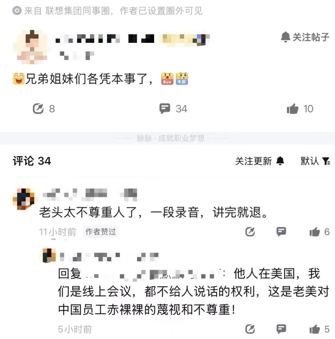另有网友疑似就赔偿问题发帖称,“兄弟姐妹们各凭本事了”;该帖子下有疑似联想员工评论称,“老头”太不尊重人,一段录音讲完就退。