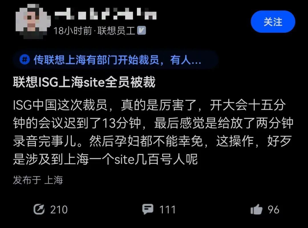 爆料贴称,联想ISG中国此次裁员,开大会15,并且分钟会议迟到13分钟,而且仅播放了两分钟录音宣布裁员事宜。