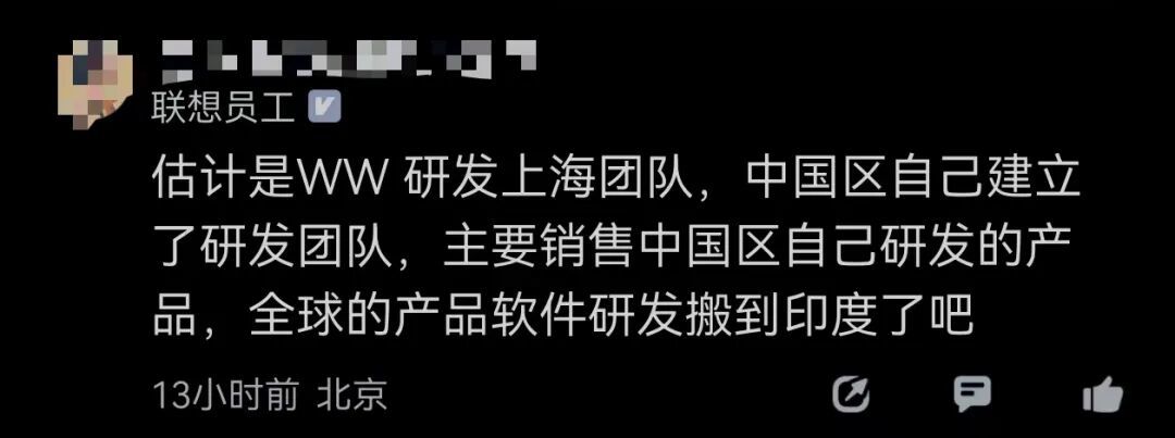 有人评论称,联想中国区自己建立研发团队,主要销售中国区自研产品,全球产品软件研发搬到印度。