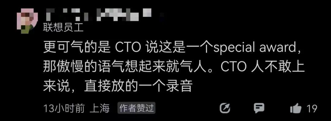 还有人称,“CTO说这是一个special award(笔者注:特殊奖励)”,“CTO人不敢上来说,直接放的一个录音”。