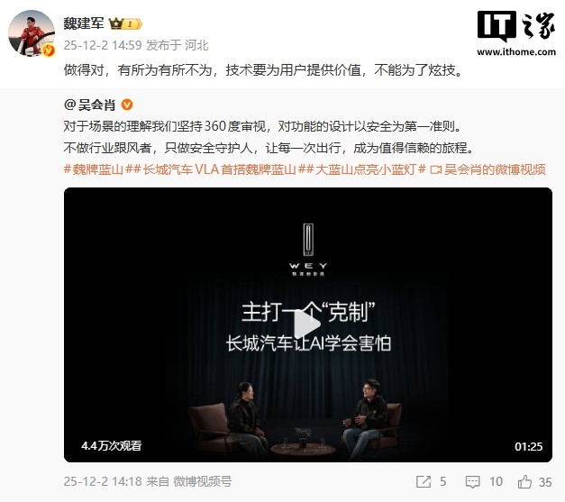 IT之家12月2日消息,长城汽车CTO吴会肖今日发微博表示,对于场景的理解我们坚持 360 度审视,对功能的设计以安全为第一准则。不做行业跟风者,只做安全守护人。