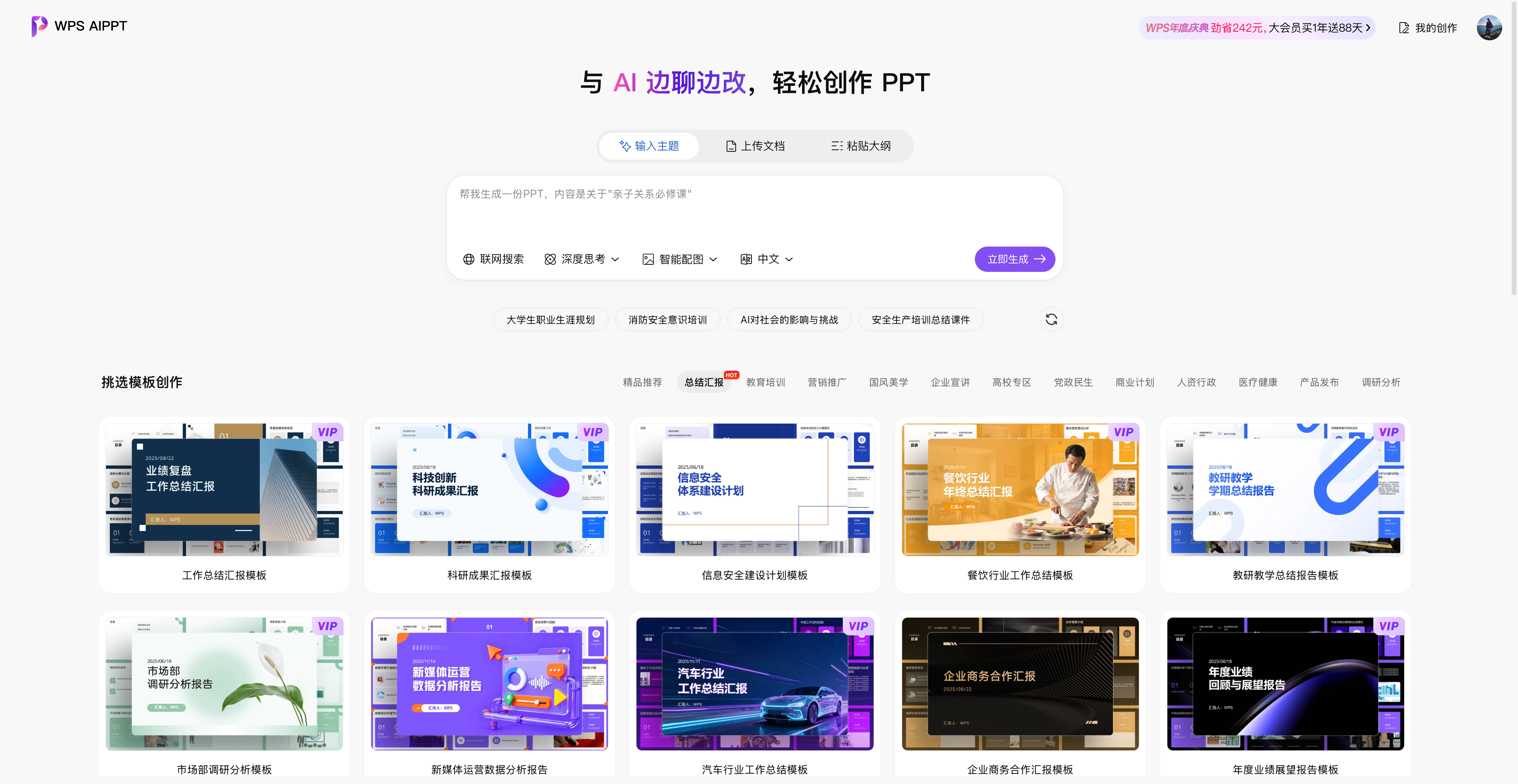 ▲ 输入主题就能得到 PPT,WPS AIPPT 官网,aippt.wps.cn