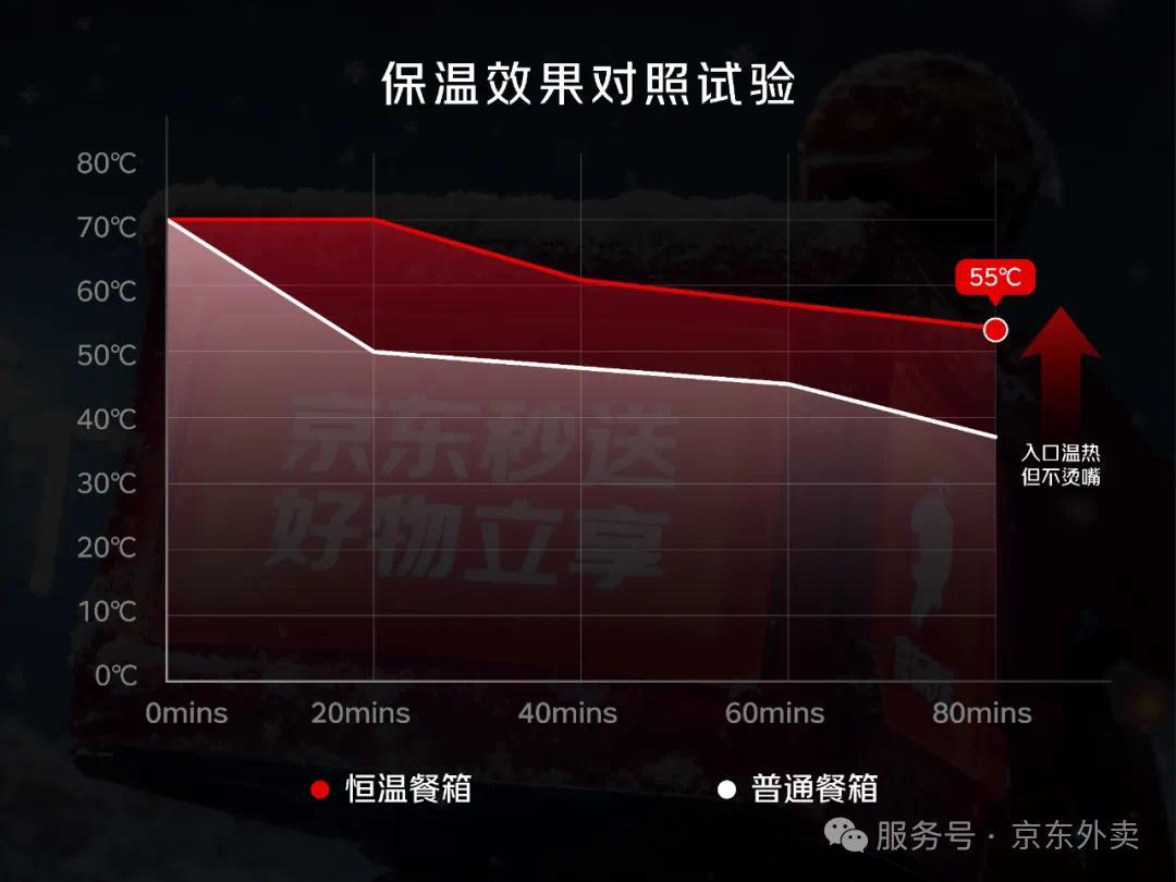 凤凰网科技讯 12月2日,京东外卖宣布,将免费为全职骑手配备定制加热餐箱。官方表示,将两份同时出锅的辣椒炒肉(初始装袋温度均为70℃)分别放入普通餐箱和升级后的加热餐箱,在相同路线下模拟超远距离配送,入箱20分钟后,升级后加热餐箱温度依旧保持在70℃ ,比普通餐箱高出 20℃,即使是60分钟以上的超远距离配送,餐箱温度仍能保持在55℃以上。