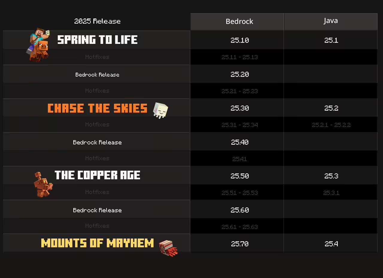 相比之下,Java 版仍会保持单独的补丁号,而基岩版则继续从发布序号向上累计。快照命名也将随之前缀体系调整,例如原称 25w41a 的 Mounts of Mayhem 首个快照,在新体系中会对应为“25.4-snapshot-1”。