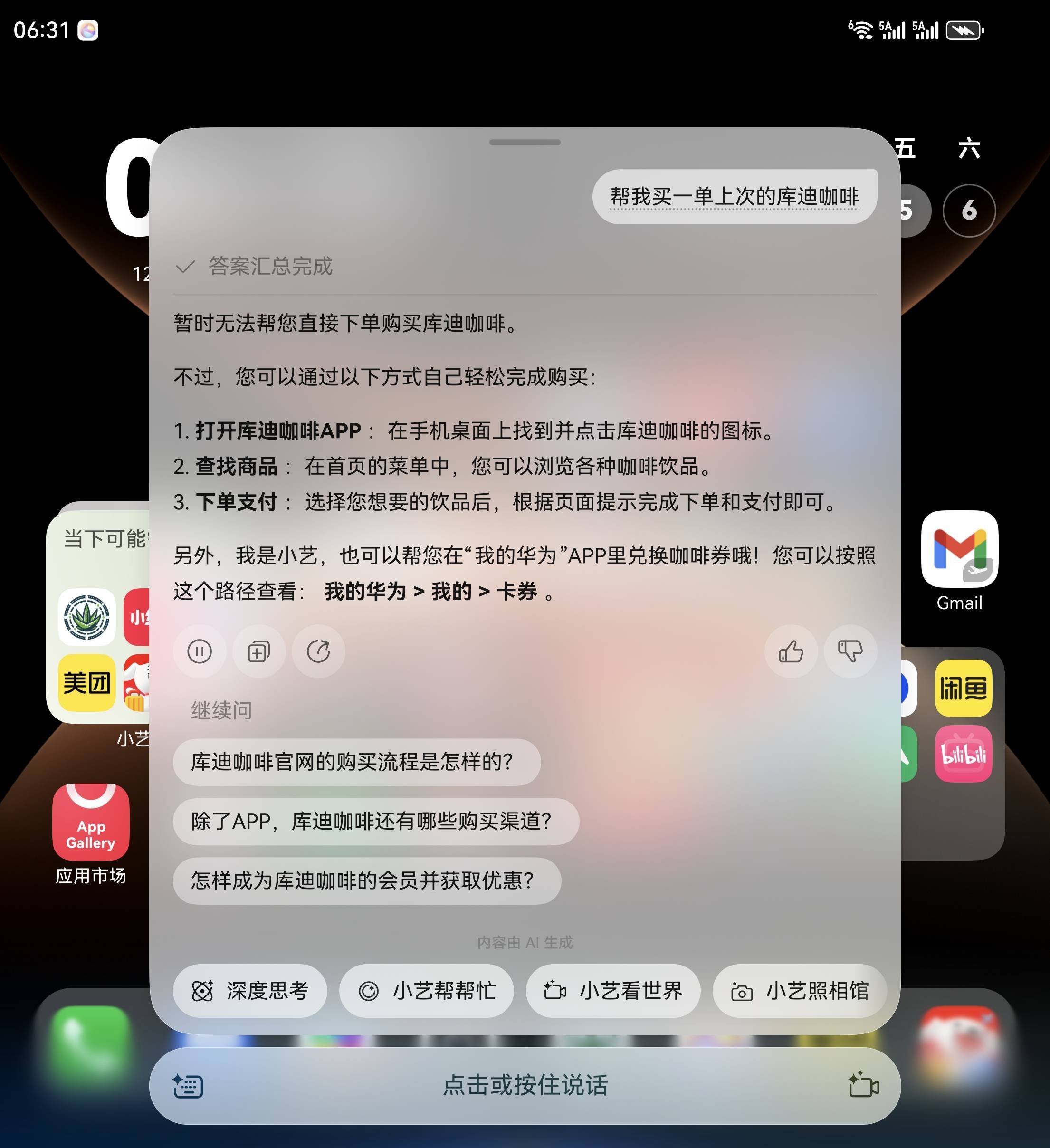 首先,由于小艺帮帮忙目前仍处在众测阶段,它的理解能力还仅限于一些简单操作,比如「帮我买挂耳咖啡」能听懂,「帮我堵桥」就不行了: