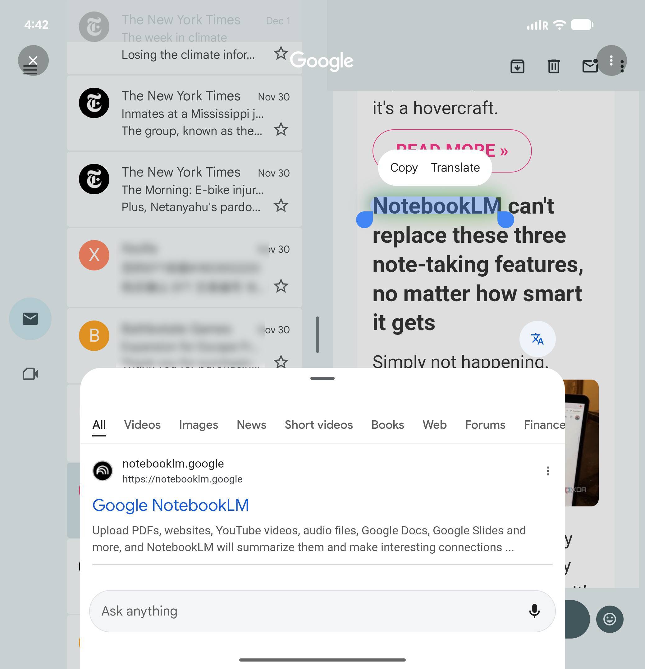 而这也是我在使用过数台折叠屏手机之后,第一次体验到系统级的功能让折叠屏的分屏模式真正有了意义。毕竟从实用性和信息密度上来说,它甚至超过了谷歌的「圈选搜索」(Circle to Search):