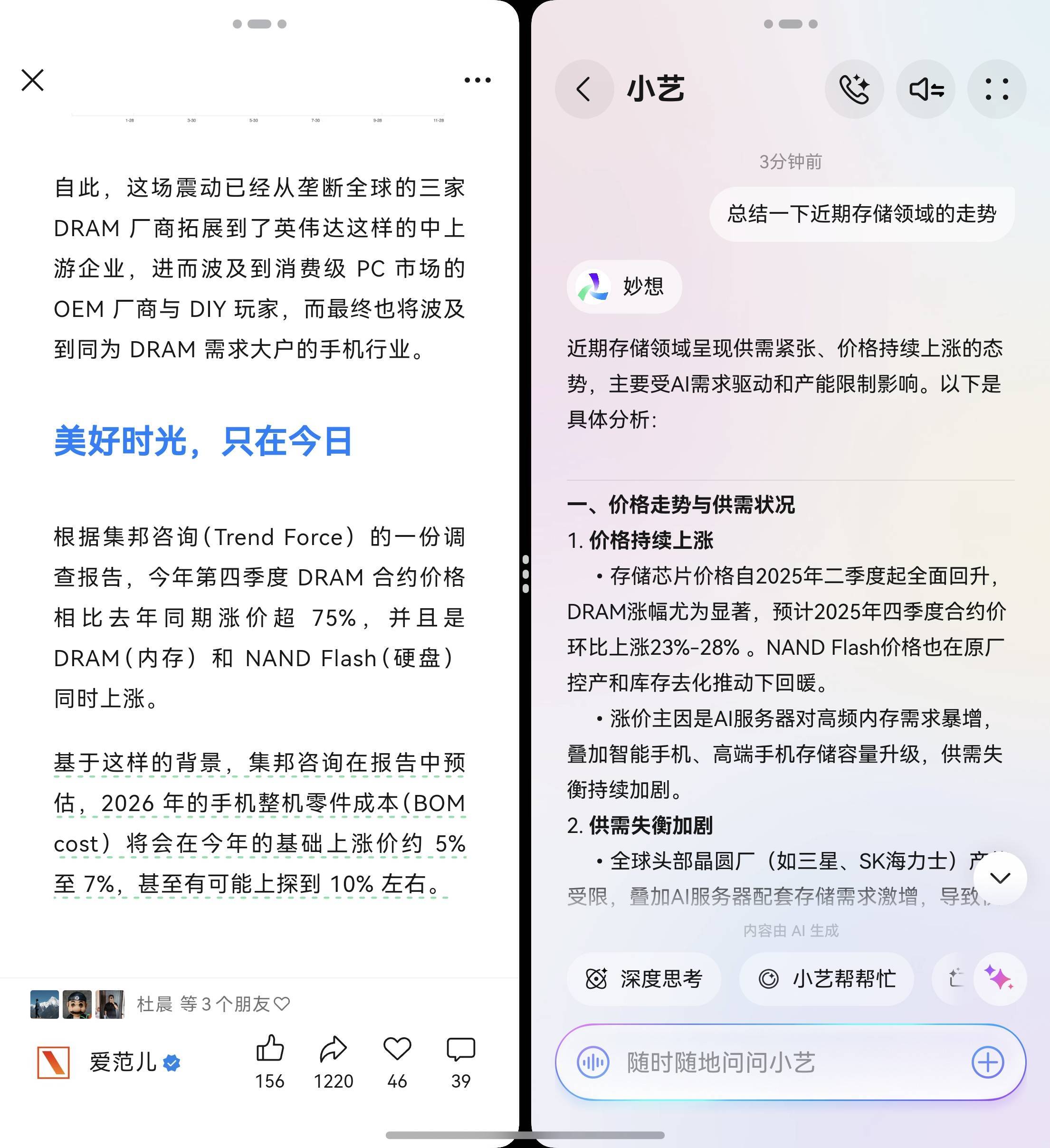 这也就意味着,你可以随时在一个第三方 app 内唤醒小艺助手,一边浏览一边问小艺。小艺会在你手指停下之后自动进行一次 OCR 让你进行提问,如果不提问就等你下一次手指停下继续识别,不会像屏幕底部呼出那样遮挡内容让你无法进行同步操作: