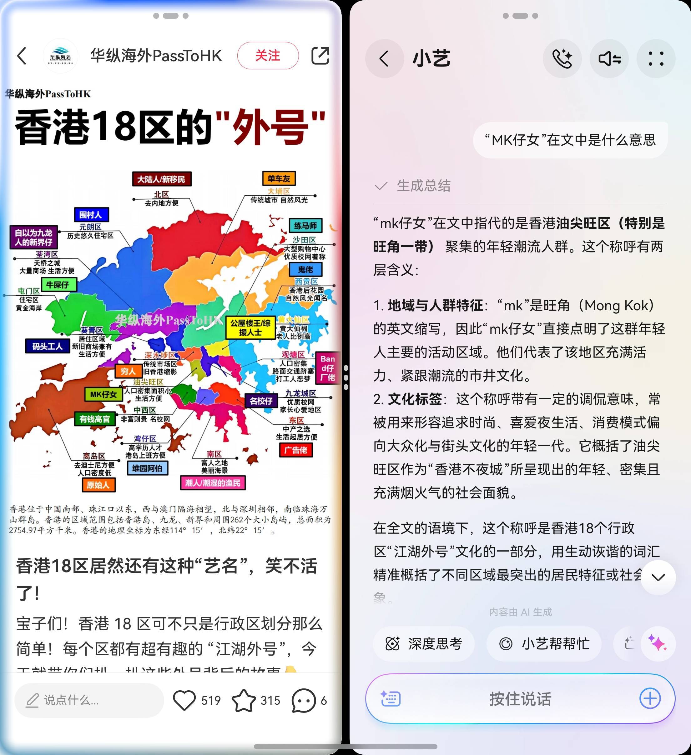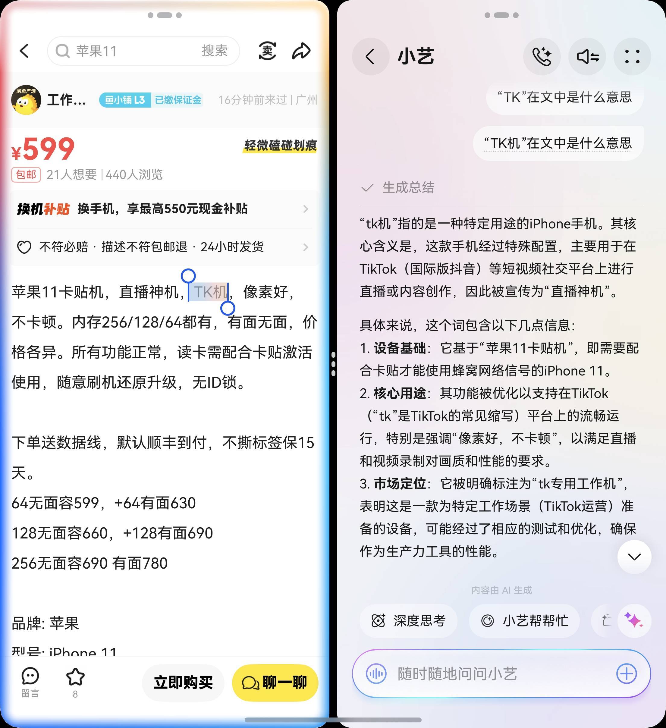 换言之,你不仅可以问小艺屏幕另一边屏幕上的文章或者信息,哪怕是图片里面混乱的路线,或者细节信息,甚至是尝试读懂闲鱼黑话,小艺的分屏联动都可以直接搞定: