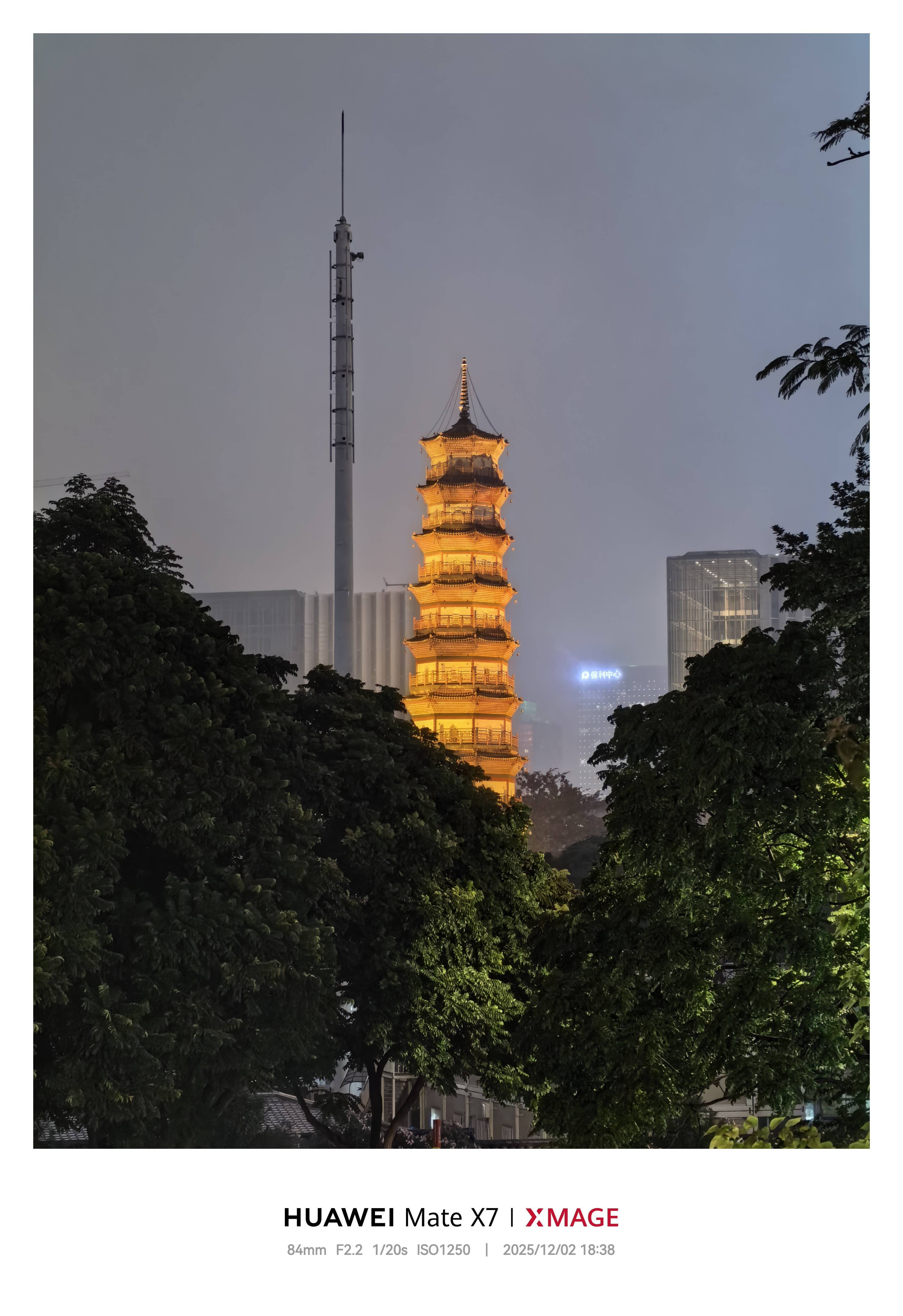 今年无论是标准版还是典藏版,都用上了一颗规格与 Mate 80 Pro Max 近似的 5000 万像素长焦微距镜头,最大光圈也来到了 f2.2,搭配 RYYB 传感器的感光度优势,让 Mate X7 拥有了超出预期的夜景表现。