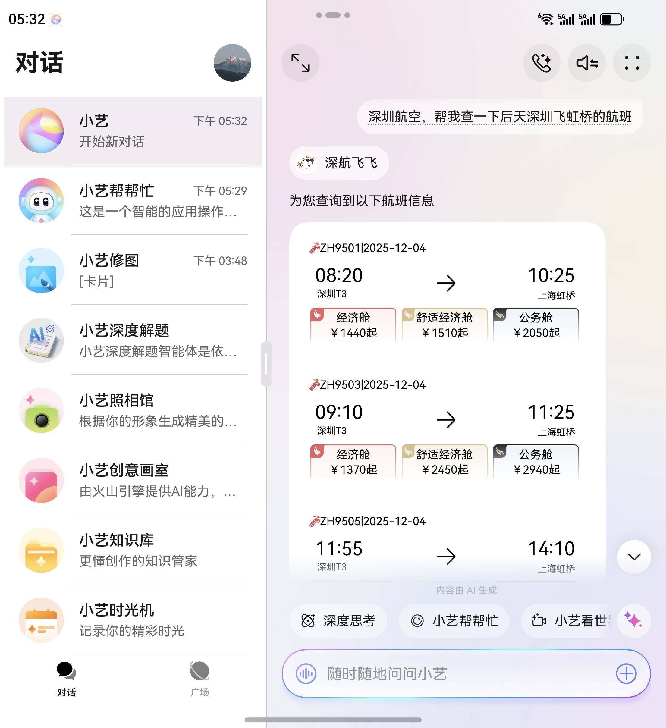 但对于已经接入小艺 A2A 的航司智能体——比如深圳航空——小艺就会直接转岗给深航智能体,生成一份带有清晰格式和舱位等级的可选时刻表: