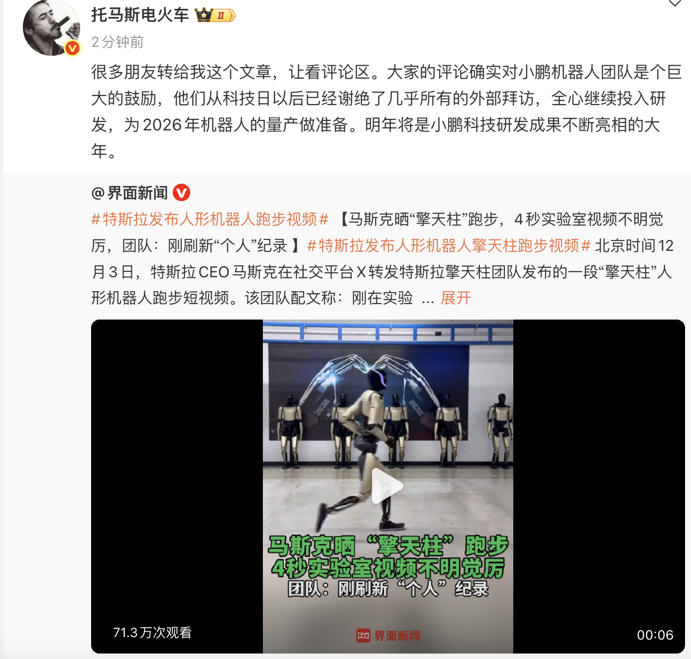 对此,小鹏汽车副总裁“托马斯点火车”发文回应,“大家的评论确实对小鹏机器人团队是个巨大的鼓励,他们从科技日以后已经谢绝了几乎所有的外部拜访,全心继续投入研发,为2026年机器人的量产做准备。明年将是小鹏科技研发成果不断亮相的大年。”