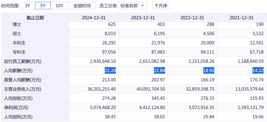 另据同花顺iFind数据,2024年,宁德时代员工的人均薪酬约22.2万元,虽较2021年的14.22万元大幅提升,但相较于2023年的22.84万元略有下降,同比减少0.64万元。