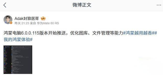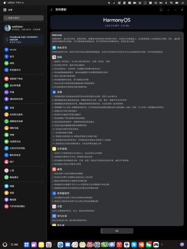 需要注意的是,MateBook Pro / Fold 鸿蒙电脑已开启 HarmonyOS 6 正式版推送,因此华为官方团队分享的更新内容与此前的花粉 Beta 版本相近,但和电脑端推送的版本有所差异,博主 @Adak封狼居胥 分享了电脑端推送版本的更新内容。