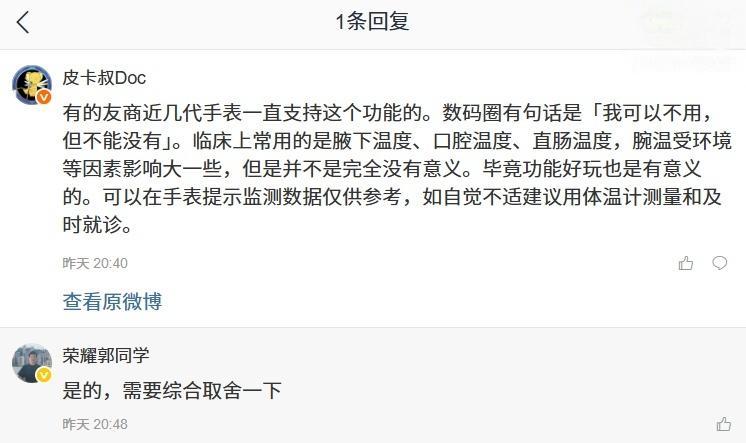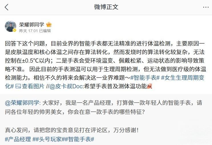 IT之家 12 月 4 日消息,荣耀全场景产品经理 @荣耀郭同学 此前透露打算做一款年轻人的智能手表,并向网友征集相关意见。博主 @皮卡叔Doc 提出:“希望手表普及测体温功能”,他对该问题进行了回复: