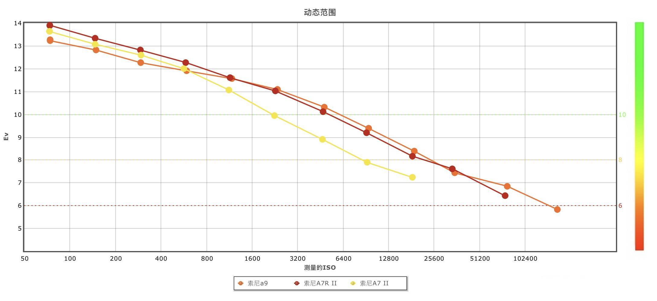 使用堆栈式传感器的高速相机往往会在某段 ISO 出现动态范围折损的问题,比如使用堆栈式传感器的索尼 A9,为了实现 20fps 连拍和无黑屏,它的电路层极其复杂,读出速度极快,但代价是高频的读出电路会引入额外的电子底噪,在 ISO 100 的基准感光度下,比 A7R2 的动态范围低了约 0.5-1 档。