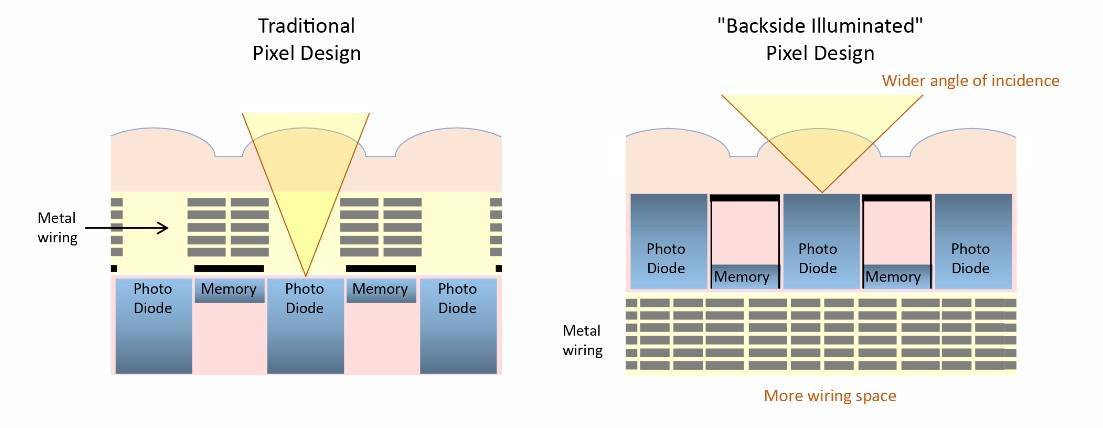 前代 A7M4 使用经典的背照式传感器(BSI),相比前照式传感器,背照式传感器把电路挪到了背面,光电二极管紧挨着彩色滤光片,解决了进光量不足的缺点,但它的问题在于数据跑道不够宽,一旦数据量大,读取速度就会明显拖后腿。