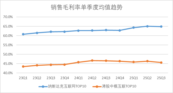 同时从利润率趋势来看,纳斯达克头部互联网企业过去三年整体的规模优势正在逐渐变大,AI纪元以来,毛利率水平从60.7%提升至64.9%。而中概互联表现就相对一般,过去三年整体的销售毛利率变化并不大,从43.5%提升至45.6%。