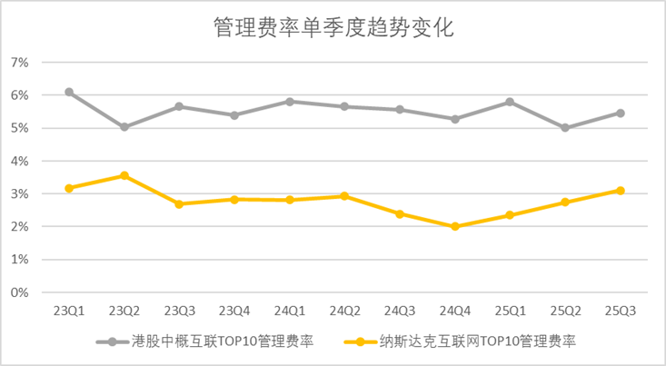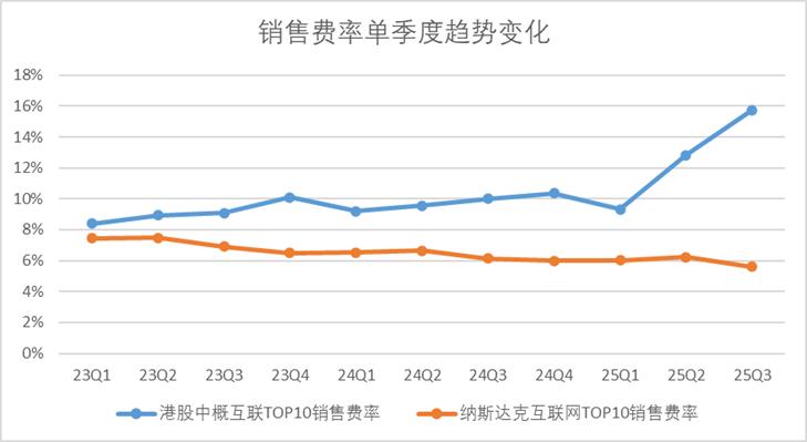 反观纳斯达克龙头互联网企业,市场竞争环境相对温和,整体销售费用率从2023年第一季度的7.4%下降至2025年第三季度的5.6%。
