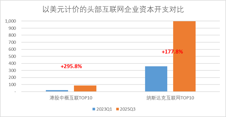 港股互联网龙头的单季度资本开支从约22亿美元升至约88亿美元,纳斯达克互联网巨头则从约360亿美元增至约1000亿美元。