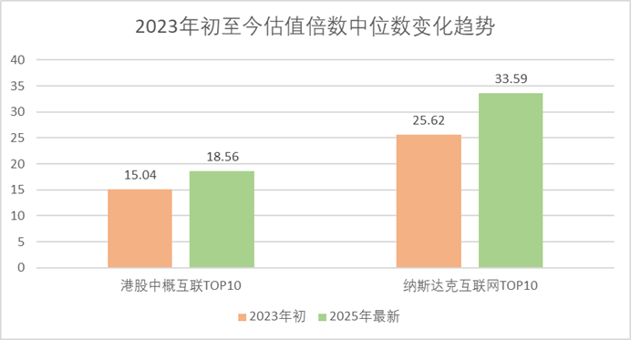 三年过去,港股中概互联的估值中位数从15倍升至18–19倍左右,与市场整体趋势一致,变化幅度不大。