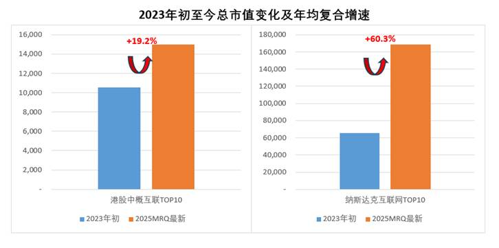 仅就年复合增速而言,AI纪元以来,纳斯达克互联网公司市值增速约为中概互联的3倍。