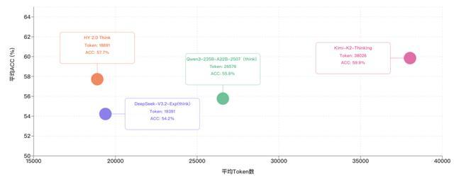 效率方面,HY 2.0 Think 引入了精细的长度惩罚策略,平衡思维链的效率和效果,避免模型堆砌废话,实现了计算资源的更有效分配。对照各模型在 IMO-AnswerBench、HMMT2025、ARC-AGI、HLE 这四个权威推理任务上的表现及其 token 消耗,可以看到 HY 2.0 Think 在取得类似的准确率下消耗更少的 tokens,单位 token 的智能密度处于“业界领先水平”。
