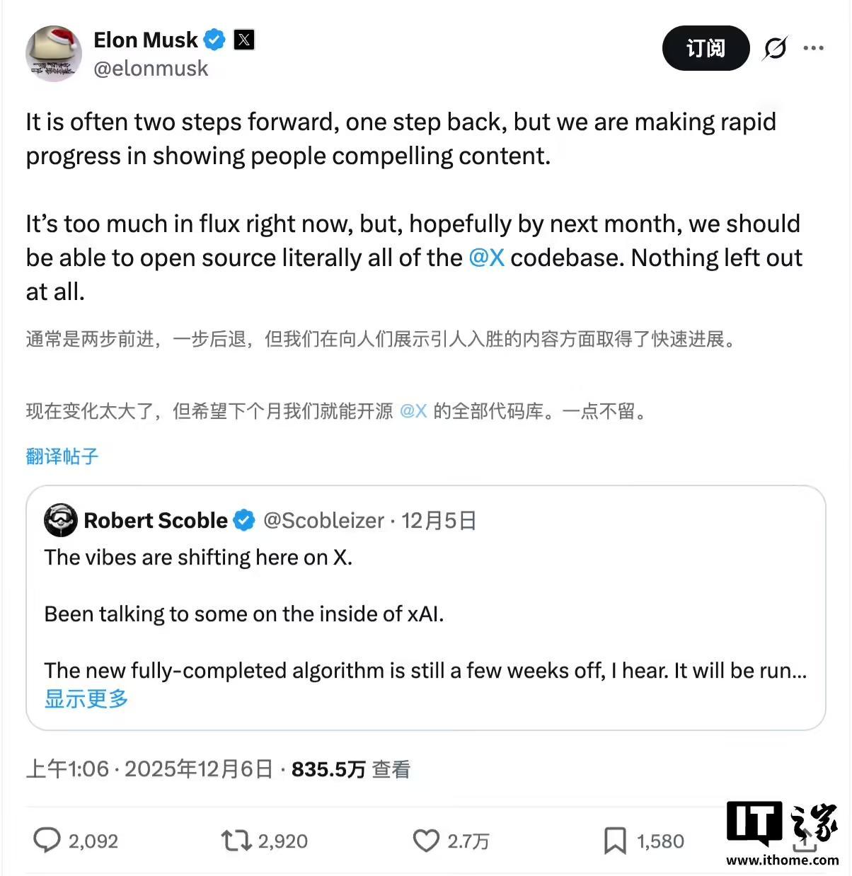 IT之家 12 月 6 日消息,北京时间今天凌晨,马斯克在 X 平台发文透露,X 在向人们展示“引人入胜的内容”这一方面进展迅速,希望下个月就能开源 X 的全部代码,毫无保留。