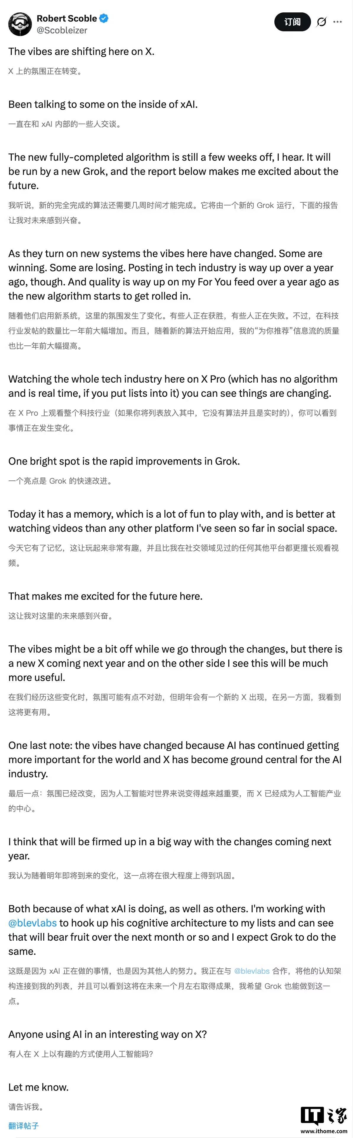 马斯克此次回复的帖子来自博主 Robert Scoble,IT之家附原文大意如下:
