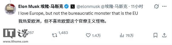 IT之家 12 月 7 日消息,当地时间 12 月 6 日,美国企业家马斯克抨击欧盟针对其社交媒体平台 X 的 1.2 亿欧元(IT之家注:现汇率约合 9.89 亿元人民币)罚款决定。