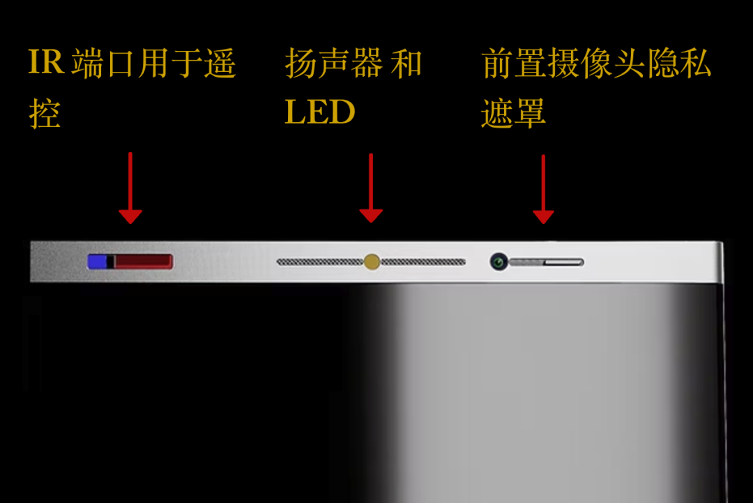居中的是扬声器+闪光灯,右边配备了前置摄像头,具有和联想笔记本类似的隐私遮罩功能。