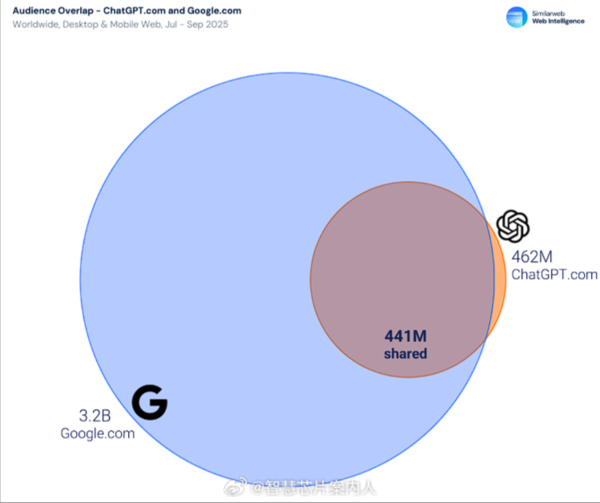 在约4.62亿名访问过ChatGPT的用户中,有95%同时也使用Google搜索,重叠用户达4.41亿人。这表明大多数用户会根据具体任务在对话式AI和搜索引擎之间切换,而非单向迁移。