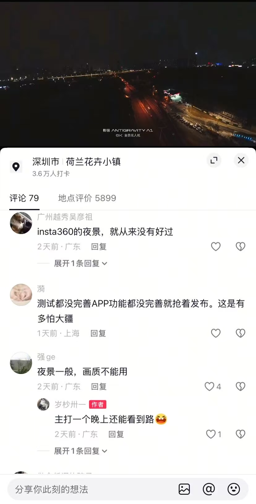 视频中显示,影翎A1在夜间拍摄时,画面纯净度低于大疆同价位产品。有网友表示,“价格在旗舰,夜景画质还停留在入门水平。”
