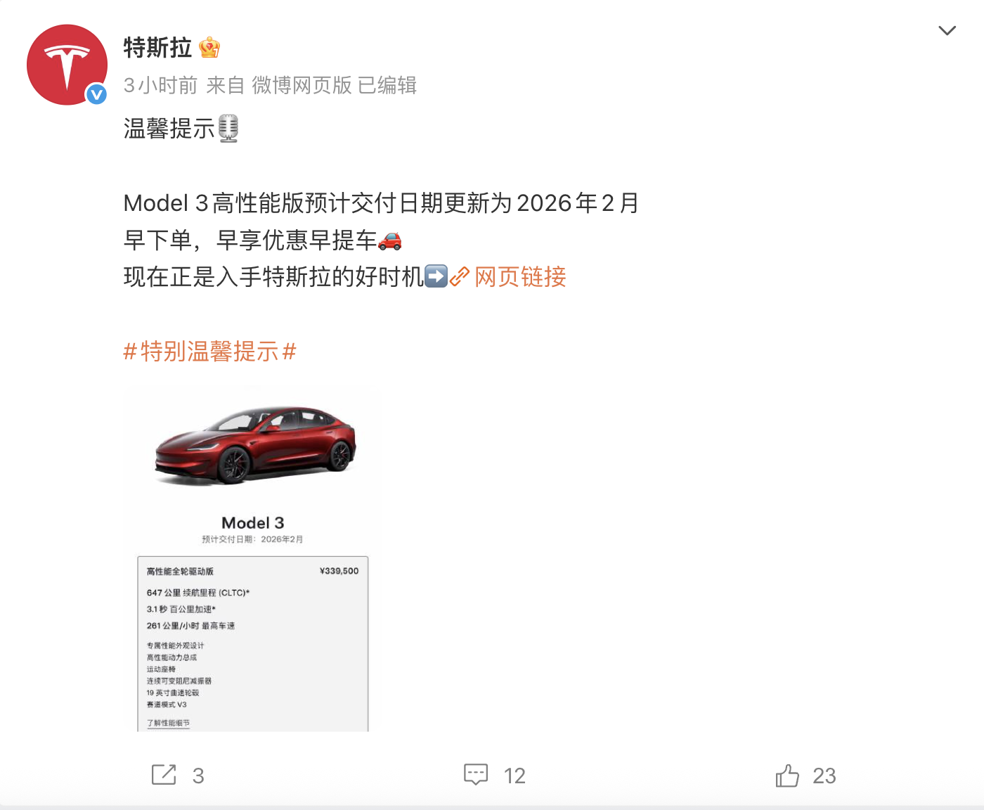 特斯拉Model 3高性能版交付日期更新:2026年2月 凤凰网科技讯 12月8日,特斯拉宣布,Model 3高性能全轮驱动版预计交付日期更新为2026年2月。 据了解,Model 3高性能全轮驱动版官方售价339500,CLTC续航里程647公里,百公里加速时间为3.1秒,还拥有专属性能外观设计、运动座椅、19英寸轮毂等。 特斯拉Model 3高性能版于去年6月上市,外观方面主打“烈焰红”配色,同时提供“星空灰”、“珍珠白”、“深海蓝”、“纯黑色”的车漆选配。 Published by 风君子 独自遨游何稽首 揭天掀地慰生平 View all posts by 风君子