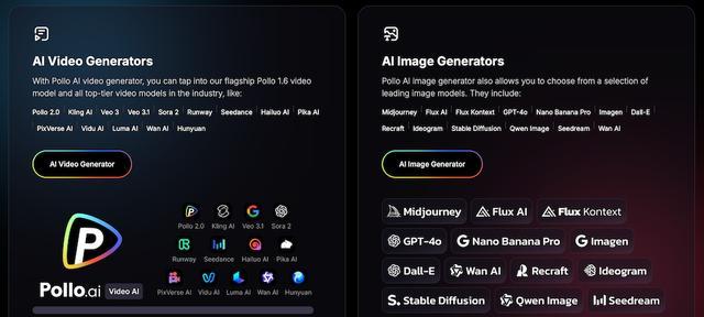 目前,Pollo AI已集成Kling AI、Runway、Veo系列、Stable Diffusion等多款主流前沿模型,覆盖文本转视频、图像转视频、视频风格转换、角色一致性、AI 动画生成以及图像生成与转换等能力,同时支持最高 8K 输出及分钟级视频生成,平台正持续完善从内容生成到编辑增强的完整工作流程。