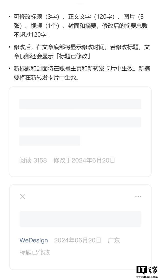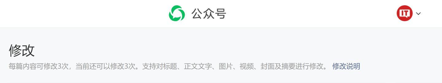 1次不够用?微信公众号文章现在可以修改3次了 IT之家 12 月 8 日消息,IT之家今日发现,微信公众号单篇文章的修改机会悄悄从 1 次扩展到了 3 次。 微信公众号修改说明显示,每篇内容可修改 3 次,支持对标题、正文文字、图片、视频、封面及摘要进行修改。 修改后,在文章底部将显示修改时间;若修改标题,文章顶部还会显示“标题已修改”。 Published by 风君子 独自遨游何稽首 揭天掀地慰生平 View all posts by 风君子