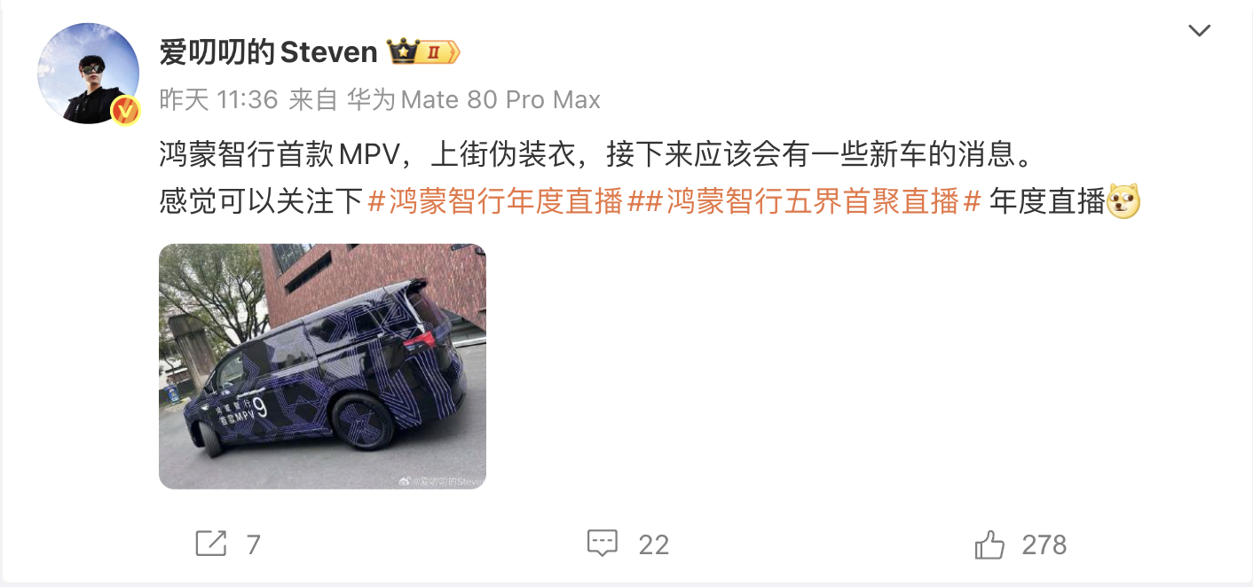 日前,博主“爱叨叨的Steven”分享了鸿蒙智行首款9系MPV伪装车的照片,并透露接下来应该会有一些新车的消息公布。