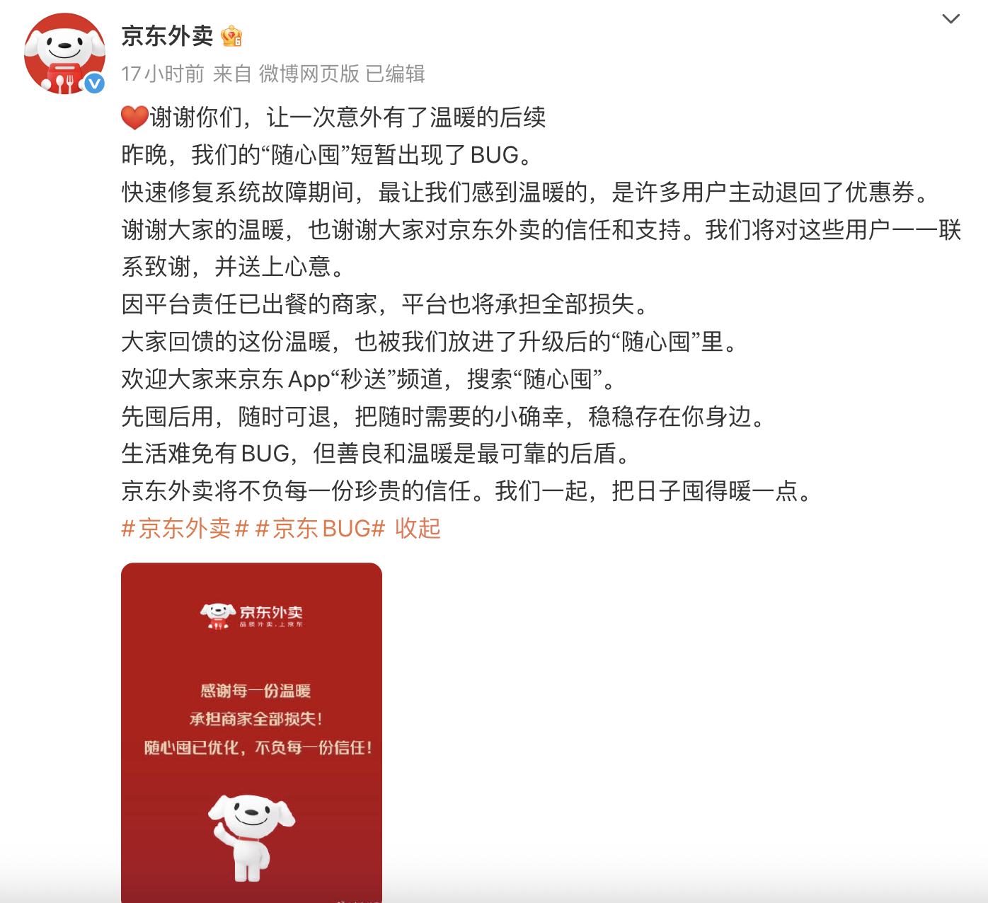 京东外卖“随心囤”出BUG,有人狂薅上百单 官方回应:平台承担全部损失 凤凰网科技讯 12月9日,京东方面回应称,“随心囤”短暂出现了系统故障,在快速修复系统故障期间,许多用户主动退回了优惠券,京东将联系致谢这些用户,并送上心意。因平台责任已出餐的商家,平台也将承担全部损失。 日前,京东外卖“随心囤”功能出现BUG。有网友反馈,购买京东外卖100张券后,申请全额退款,平台只回收1张券,剩余99张还在用户手里,为此有网友连续下了上百单外卖。 Published by 风君子 独自遨游何稽首 揭天掀地慰生平 View all posts by 风君子