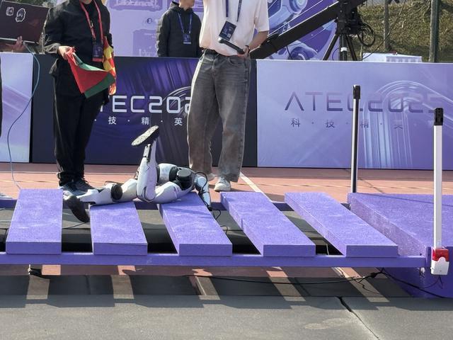 吊桥穿越任务中,机器人需要通过三种不同间距的桥面段,自主识别桥面结构,决定是否需要借助工具通过、是否拉绳搭桥等。有的选手给机器人装上宽大的“脚底板”,避免穿越过程中被缝隙卡住;有的机器狗通过跳跃绕开缝隙,还省略了拉绳搭桥的步骤。