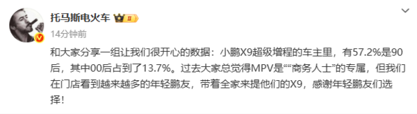 【CNMO科技消息】12月10日,小鹏汽车副总裁“托马斯电火车”发文称,在小鹏X9超级增程的车主中,90后占比高达57.2%,00后更是占据了13.7%。“托马斯电火车”表示,以往被视为“商务人士”专属的MPV车型,如今正吸引着越来越多的年轻消费者。