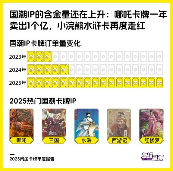 国潮IP卡牌交易量同比大幅上升332%。其中,哪吒卡牌年度交易额超过1亿元,水浒、三国等经典名著题材卡牌热度显著提升。影视综艺类卡牌订单量同比提升130%,《永夜星河》《白月梵星》等国产剧集相关卡牌进入交易榜前列。