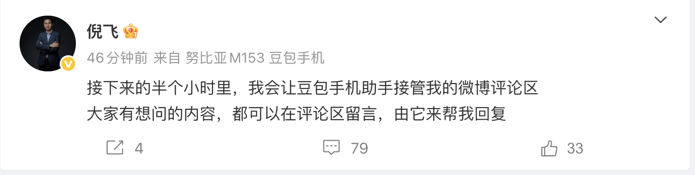 努比亚总裁倪飞称用豆包手机接管个人微博评论区 凤凰网科技讯 12月10日,努比亚总裁倪飞发文称,让豆包手机接管他的微博评论区,豆包将会回答网友提出的问题。 而豆包回答的第一个问题就是“豆包手机如何解决腾讯、阿里封杀这一大难题”?豆包称,关于相关的合作和产品规划,后续会通过官方渠道公布相关信息,你可以关注官方消息来获取内容。 Published by 风君子 独自遨游何稽首 揭天掀地慰生平 View all posts by 风君子