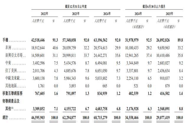 传音控股瞄准新兴市场用户使用需求,其大部分收入来自非洲和新兴亚太市场,2022年至2024年,非洲市场手机产品的营收占比已由40.6%下降至29.9%,而营收额则小幅上涨,这意味着,传音控股在保持非洲市场优势的同时也在不断扩展其他市场用户。以下为报告期间,该公司按地区划分的营收额及较总营收的占比: