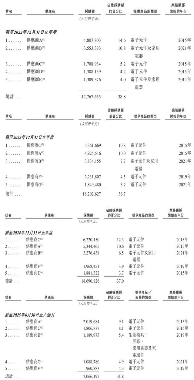 2022年、2023年、2024年及2025年上半年,五大供应商分别占传音控股总采购额的38.8%、36.7%、37.0%、31.8%,最大供应商的采购额分别占总采购额的14.6%、10.8%、12.3%、9.1%。